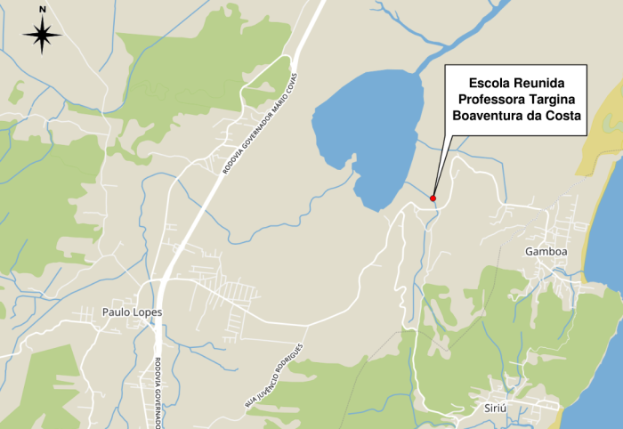 A Escola Reunida Professora Targina Boaventura da Costa situa-se na área rual do município de Paulo Lopes–SC, como mostra a Figura 1. É mantida pela Secretaria Municipal de Educação de Paulo Lopes, então trata-se de uma Escola de educação básica municipal. A Escola Targina é localizada pelas coordenadas geográficas com latitude 27°57’06“S e longitude 48°38’42”W e, está na borda da Unidade de Conservação do Parque Estadual da Serra do Tabuleiro, especificamente entre a Lagoa do Coração e a Área de Preservação Ambiental (APA) da Baleia Franca. Configura uma área relevante de amortecimento de águas e biodiversidade da flora e fauna, com vegetação da floresta ombrófila densa, mangues e restinga (FATMA, 2009).