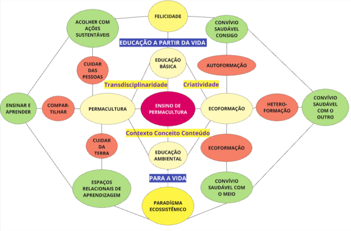 Por meio da obra “Ensinando Permacultura”, organizada por (Nanni et al., 2019), conhecemos as formas de ensinar permacultura, com o currículo baseado na proposta de Bill Mollison. Assim como na Ecoformação, todas as propostas em ensino de Permacultura apresentadas podem facilmente permear um Projeto Criativo Ecoformador. Pois, o conjunto de princípios éticos e conceitos epistemológicos que as estruturam são similares. O mapa mental da Figura 3 apresenta as relações causadas pelo ensino de permacultura na educação básica.
