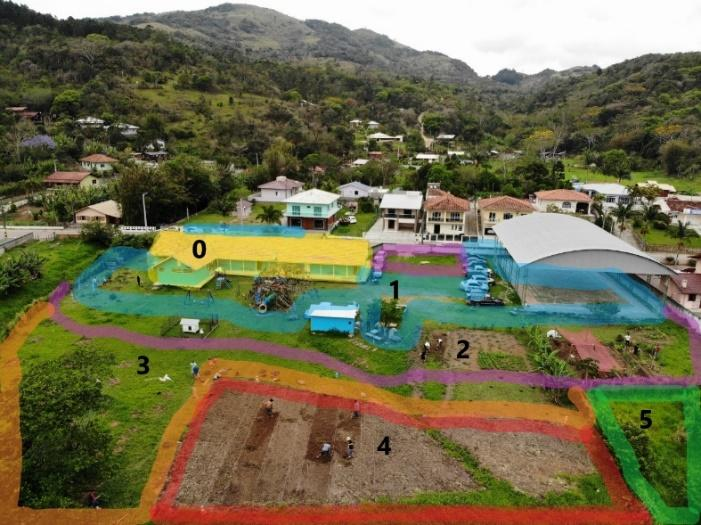 Buscando complexificar e diversificar o sistema e as oportunidades de fruição e pesquisa, foi implementada, junto à horta, uma linha de bananeiras, com o objetivo de proteger do vento, sombrear, fazer solo, reter água e obter rendimentos para compartilhar. Essas conexões, entre elementos e suas funções, como a horta (pedagógica, produção de alimentos, inspiração) e as bananeiras (barreira, biomassa, produção de frutas) são analisadas e utilizadas como preceitos no desenho de planejamento em permacultura. A Figura 4 mostra o desenho de zoneamento energético da escola a partir da zona 0, onde ficam concentradas as interações humanas. Sob a perspectiva da eficiência energética do sistema, o desenho se expande para a zona 1 e assim por diante.