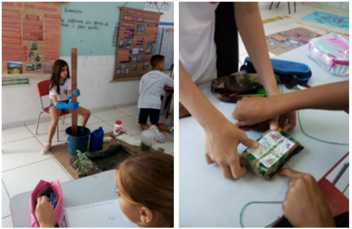 Dentre tantos PCE, o Sabão de Ervas Boaventura (Figura 6) se destaca por permear todos os outros e por ser o pioneiro. Realizado na Escola Targina de 2017 até 2024, promoveu o reaproveitamento do óleo usado de cozinha advindo da comunidade (Figura 7). A prática foi identificada como um interesse das pessoas e durante o desenvolvimento do projeto, com o uso do sabão na Escola, os estudantes questionaram sobre a destinação das águas da cozinha. Por isso, projetaram e executaram o círculo de bananeiras para o tratamento das águas cinzas (Figura 8). Os estudantes realizaram muitas experiências, integrando saberes e tocando em questões emergentes locais, regionais e mundiais, promovendo ações práticas descentralizadas, sustentáveis e de fácil aplicabilidade.