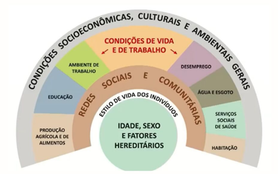 No modelo de Dahlgren e Whitehead (1991) podemos identificar os determinantes individualmente, seguidos do comportamento, estilo de vida, a das redes comunitárias e de apoio. Influenciam no próximo nível fatores relacionados às condições de vida, como trabalho, educação, serviços de saneamento e de saúde, entre outros. Na camada externa encontram-se os macrodeterminantes relacionados às condições econômicas, culturais e ambientais da sociedade. Cada nível elencado aponta especificidades para orientar a construção de políticas públicas que atuem sobre os determinantes sociais – micro e macro – para garantir a proteção pessoal, comunitária e ambiental com combate às desigualdades sociais e econômicas. Para Buss e Pellegrini Filho (2007), as condições de vida e saúde das pessoas estão associadas às desigualdades sociais às quais estão expostas.