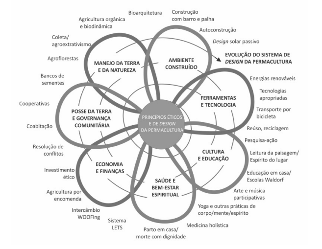 A Permacultura, idealizada por Bill Mollison e David Holmgren nos anos 70 do séc XX, apresenta uma abordagem ecológica ancorada nos princípios de cuidado com a terra, cuidado com as pessoas e com o futuro e a partilha justa. Propõe um planejamento ambiental e social centrado na construção de territórios autossuficientes e resilientes para a permanência comunitária, composto por sistemas interligados, integrados e inspirados nos padrões naturais (Holmgren, 2013, 2009; Mollison, 1988).