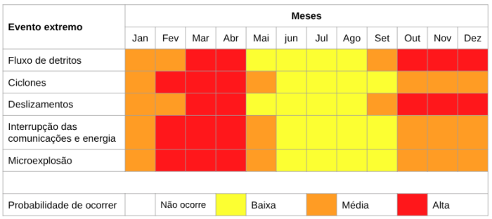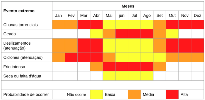 O quadro a seguir apresenta uma síntese de eventos mitigáveis e um calendário de probabilidade de ocorrência, considerando as condições climáticas ao longo do ciclo anual.