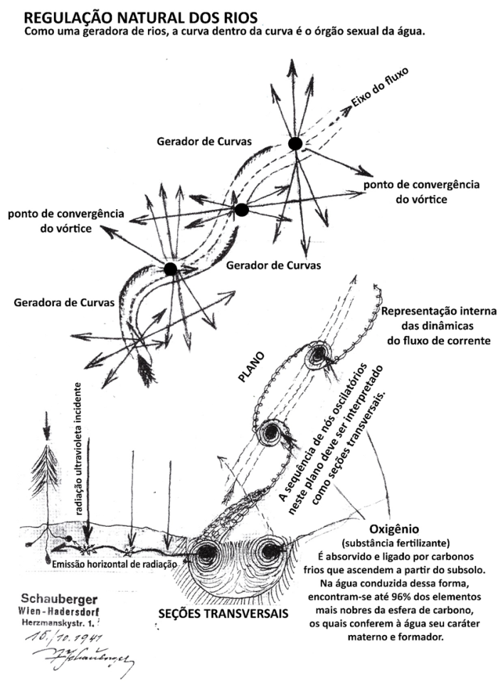 Nesse sentido, Schauberger afirmava que, em um rio, o movimento helicoidal que ocorre na parte interna de cada meandro, a chamada “curva dentro da curva”, constitui o órgão sexual da água, já que nesse ponto de inflexão a corrente se regenera, fertiliza e multiplica sua vitalidade. O autor explica que o movimento espiralado longitudinal da água dentro do meandro do rio, uma espécie de vórtice interno que faz a corrente ascender pela margem côncava e retornar pelo fundo, cria zonas de sucção e compressão que lhe permitem absorver oxigênio e nutrientes do subsolo, misturando-os ao fluxo vivo do rio. Essa concepção foi posteriormente aprofundada por John Wilkes, criador das Flow Forms, que demonstrou como o movimento em espiral e o ritmo pulsante da água promovem processos de autodepuração e revitalização do fluxo. Logo, tanto em Schauberger quanto em Wilkes, a forma e o movimento da água revelam um princípio morfogenético essencial à regeneração dos ecossistemas aquáticos (Wilkes, 2003).