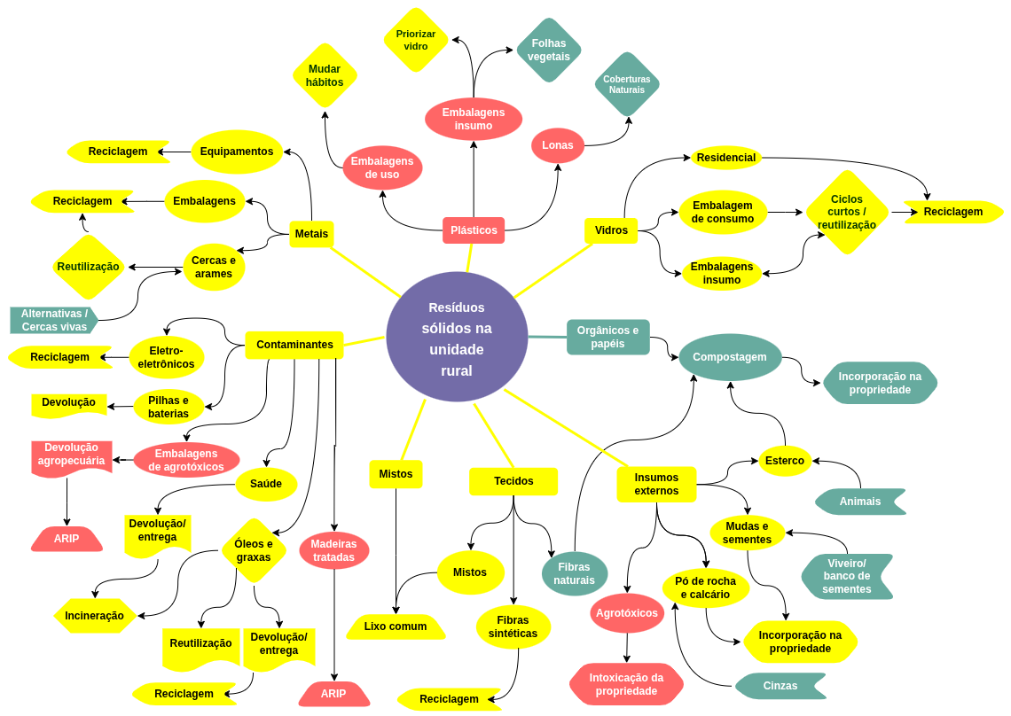 Considerando toda a gama de produtos consumidos em uma unidade rural, seja ela convencional, orgânica ou agroecológica, a equipe de permacultores que discutiu a presença dos resíduos sólidos em ambiente rural, optou por lidar com todos eles, seguindo, também, a lógica semafórica. Desta forma, um mapa conceitual (Figura 5) foi trabalhado para esquematizar, de forma sistêmica, como pode ser conduzida a gestão dos resíduos considerando as seguintes perguntas: